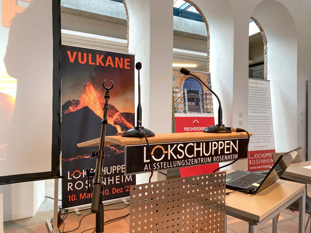 Vom 10. März bis 10. Dezember 2023 präsentierte das Ausstellungszentrum Lokschuppen in Rosenheim die Ausstellung VULKANE. Vulkanausbrüche sind potenziell sehr gefährliche, zugleich aber atemberaubende Naturschauspiele. Das Leben auf der Erde wäre dennoch ohne Vulkane nicht möglich, denn diese sorgen für den Temperaturausgleich.