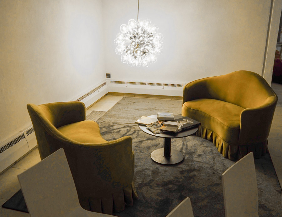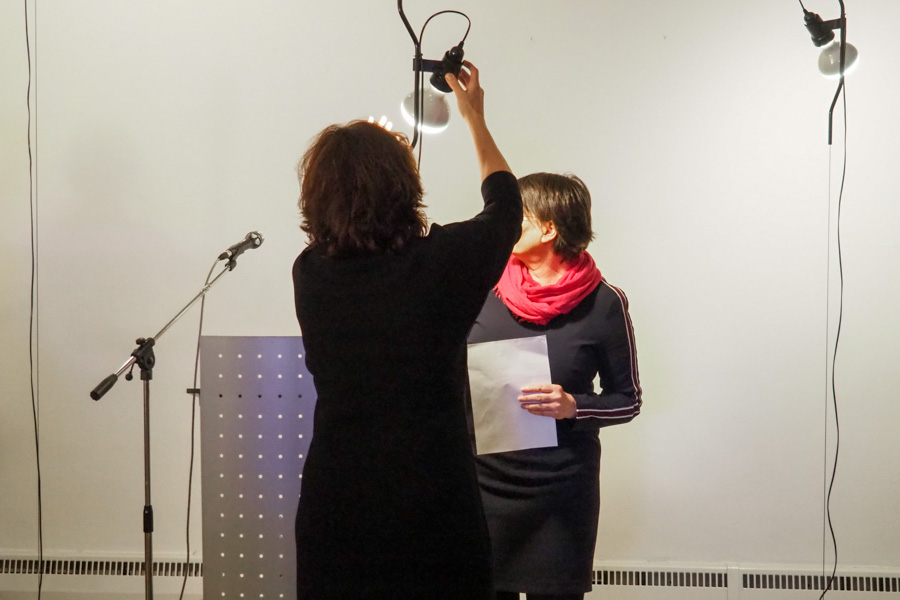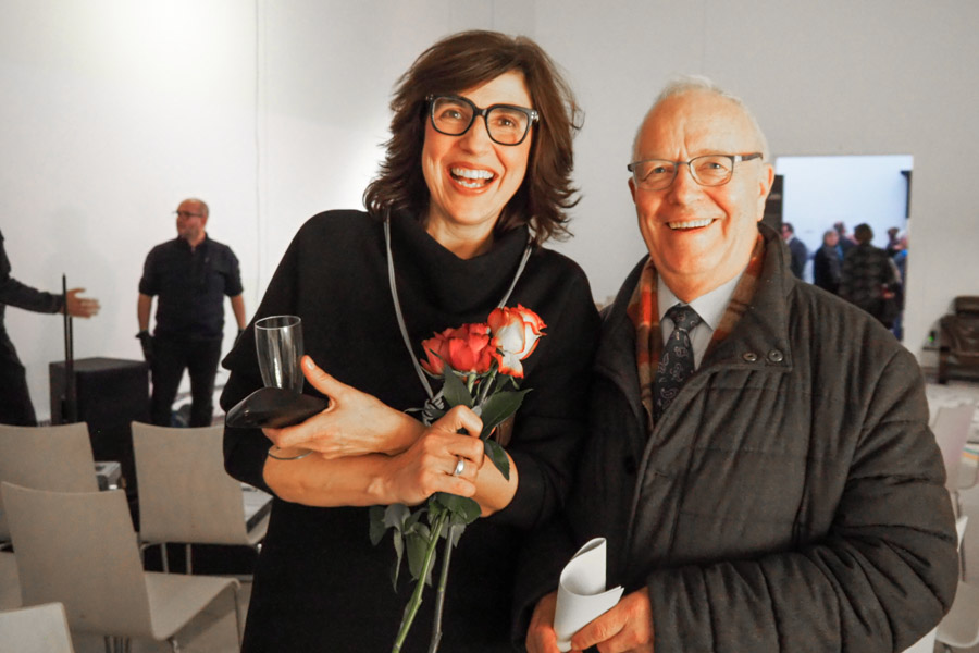 Die Leuchten (auch eine original Ingo Maurer aus den 1970er Jahren) stellte Volker Bathe (Bombillas Lichtstudio) zur Verfügung - hier mit Galerieleitung Monika Hauser-Mair.