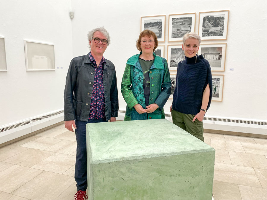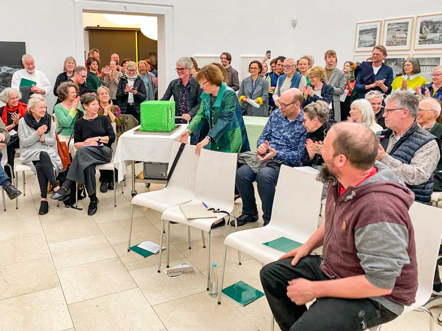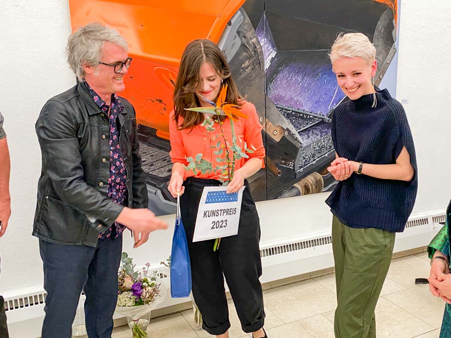 Kunstverein Vorstand Bernhard Paul übergibt stellvertretend den Kunstpreis an die Tochter (mitte) des Kunstpreis-Gewinners Heiner-Matthias Priesnitz