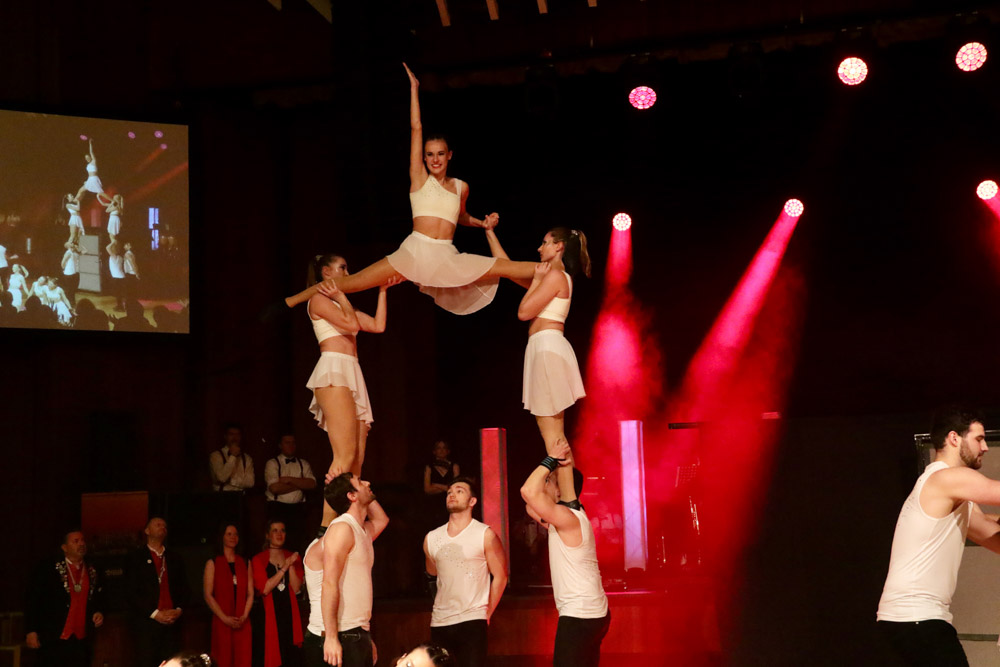 Besonders atemberaubend waren die akrobatischen Einlagen der Faschingsgilde Bad Endorf mit Prinz Marinus I. (Herrscher über Unfug und Schabernack aus dem Tal der 11 goldenen Ritter) und Prinzessin Marina II. (strahlende Hoheit aus dem Wolkenreich der fliegenden Einhörner). Ihr Motto lautete: JEIN. Dabei flogen die Akrobaten im wahrsten Sinne des Wortes durch die Lüfte, bauten Menschenpyramiden in schwindelerregenden Höhen und brachten den Saal zum Beben. Das Publikum war so begeistert, dass es für diese Darbietung sogar Standing Ovation gab.