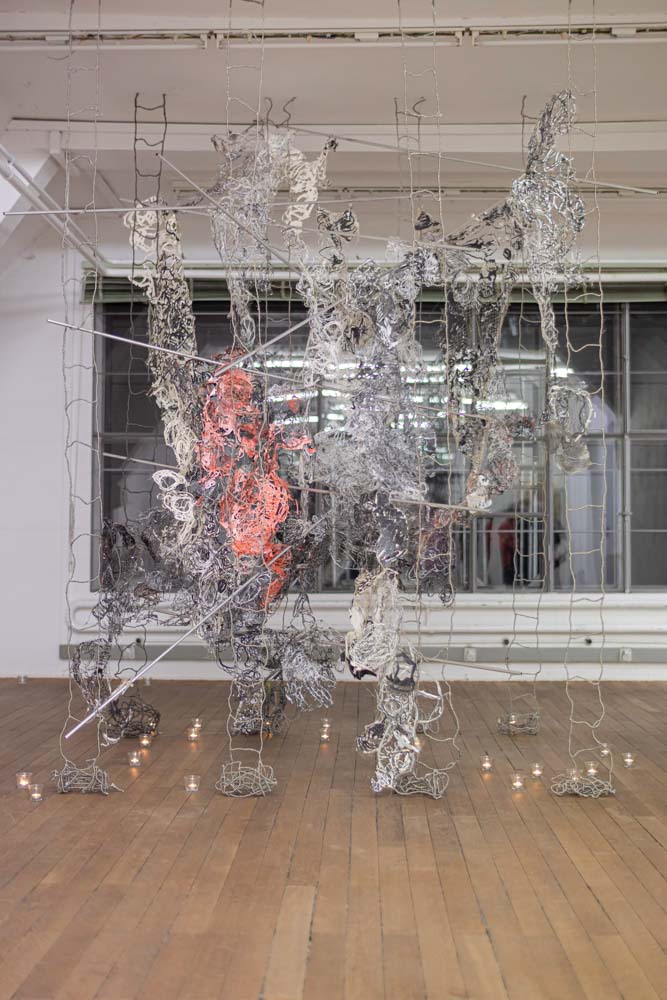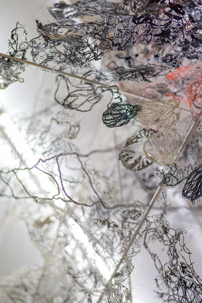 Für Installationen werden Drähte, Kabel, Plastik, Klebeband und Fäden verwendet – ein urbanes verworrenes und lebendiges System, das ein komplexes Geflecht des städtischen Lebens sehr anschaulich verkörpert. In den Plexiglaskästen schichtet die Künstlerin Cutouts: feine Wege, Grenzen und Wasseradern werden gezeichnet, ausgeschnitten und Schicht für Schicht überlagert, schimmern durcheinander durch, bilden neue komplexe Systeme.