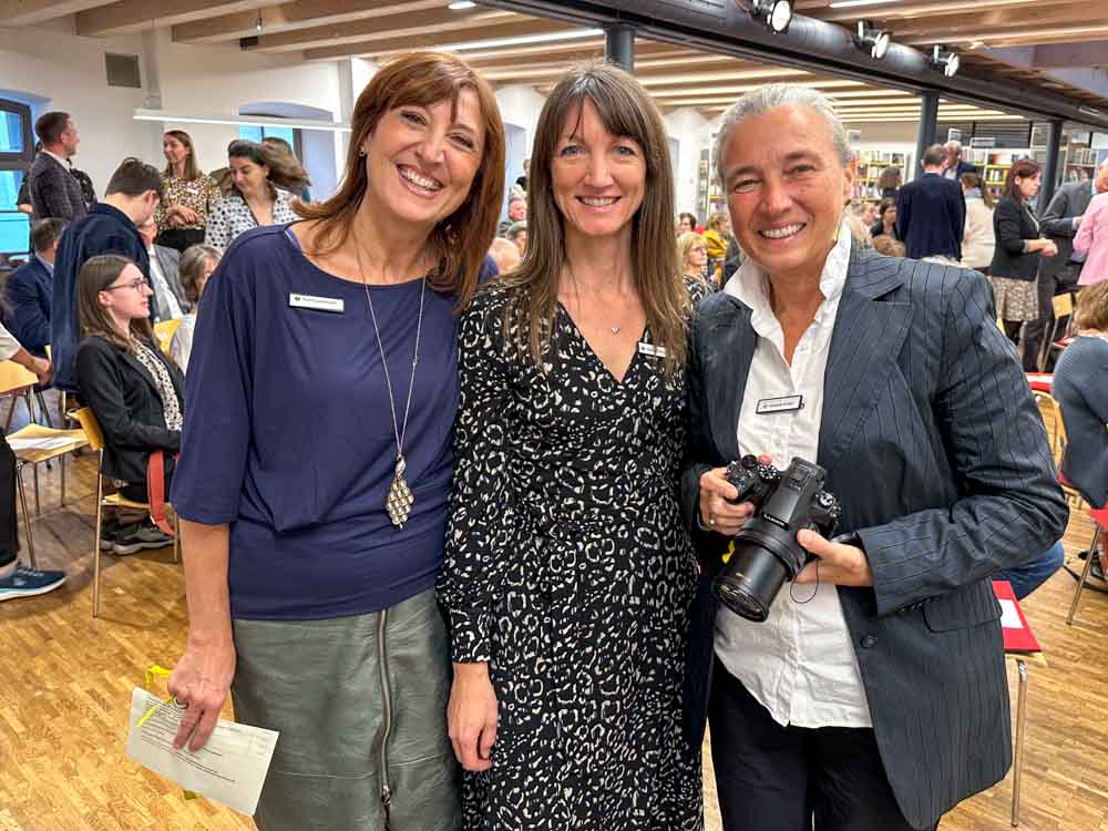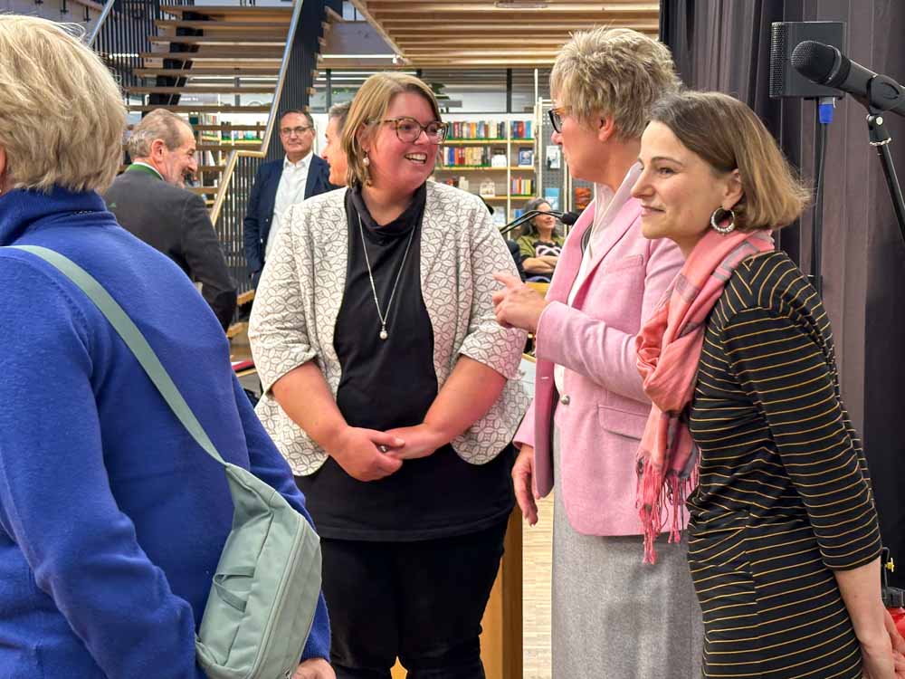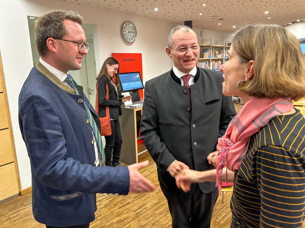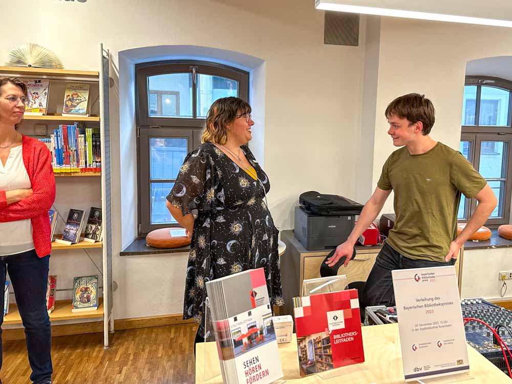 Markus Blume (Bayerische Staatsminister für Wissenschaft und Kunst MdL, Mitte) und Dr. Ute Eiling-Hütig (Bayerischer Bibliotheksverband) überreichen Gabriele Huber (Stadtbücherei Bad Aibling, Mitte) den Sonderpreis