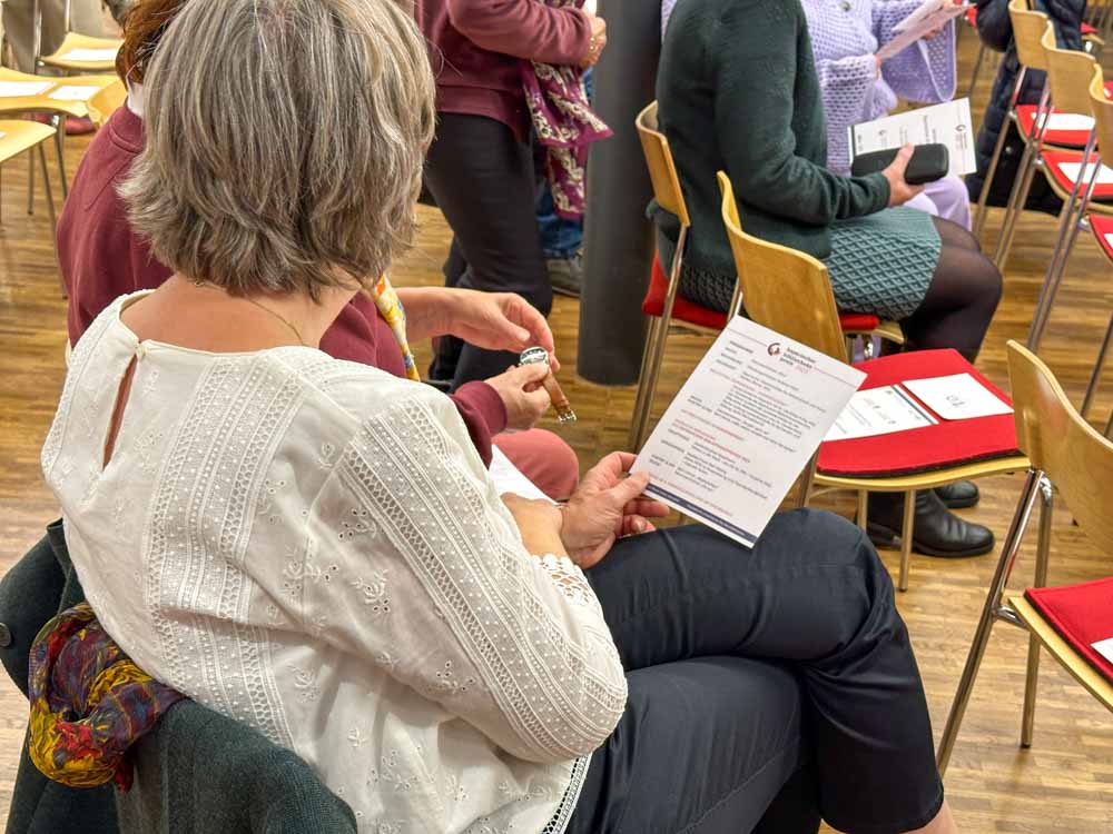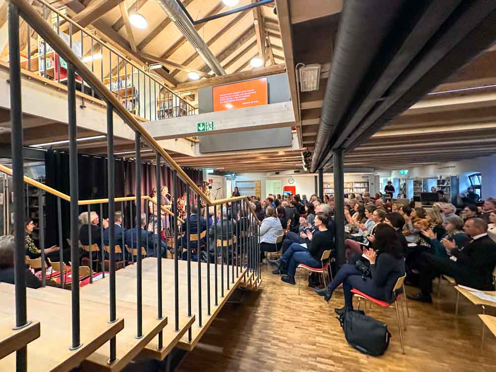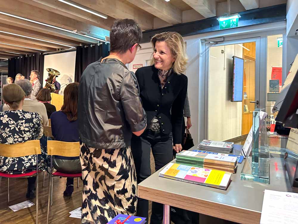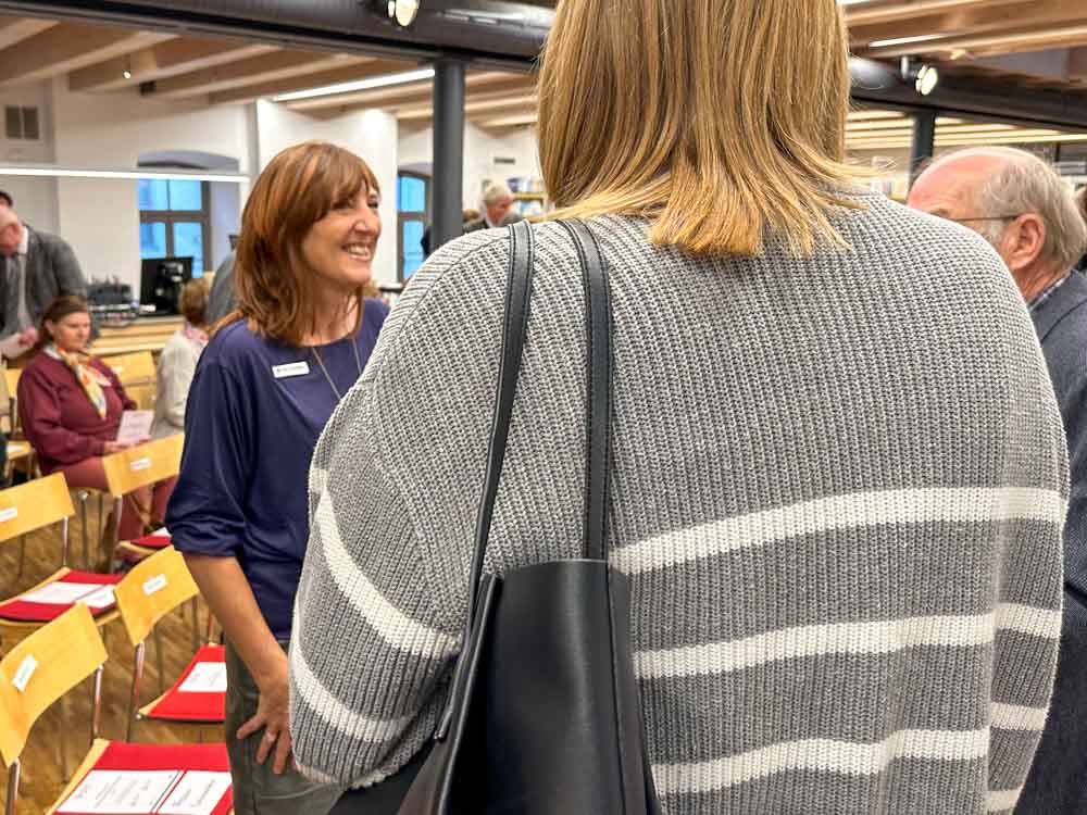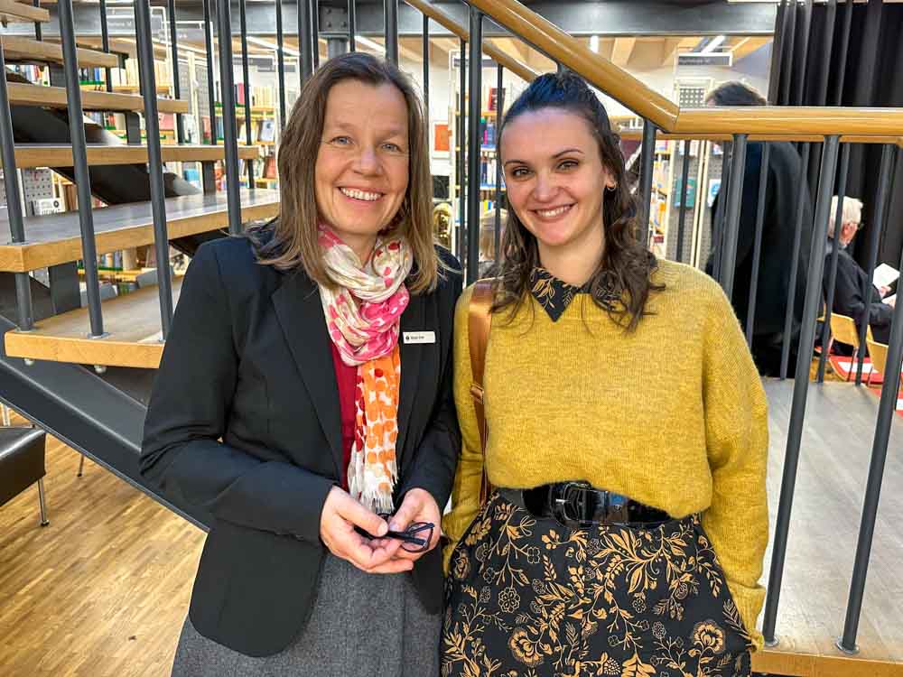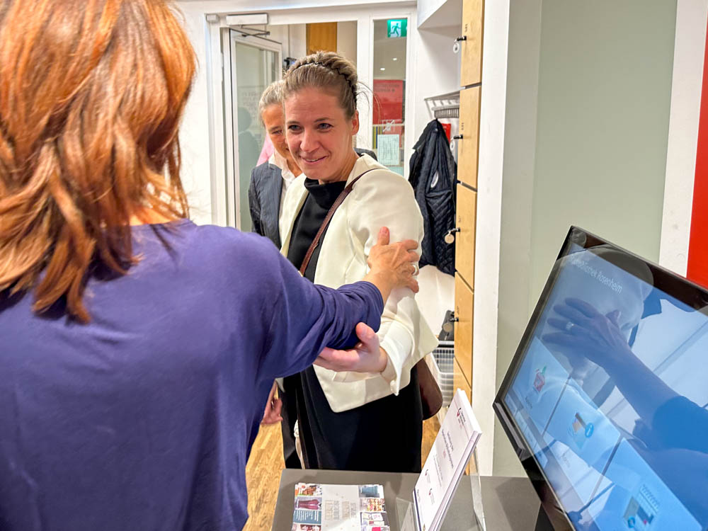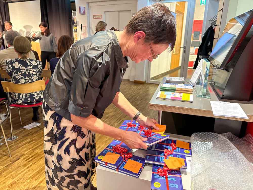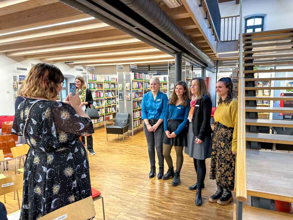 Susanne Delp (Stadtbibliothek Rosenheim) freut sich über den Stadtbibliothek Song von den Neurosenheimern