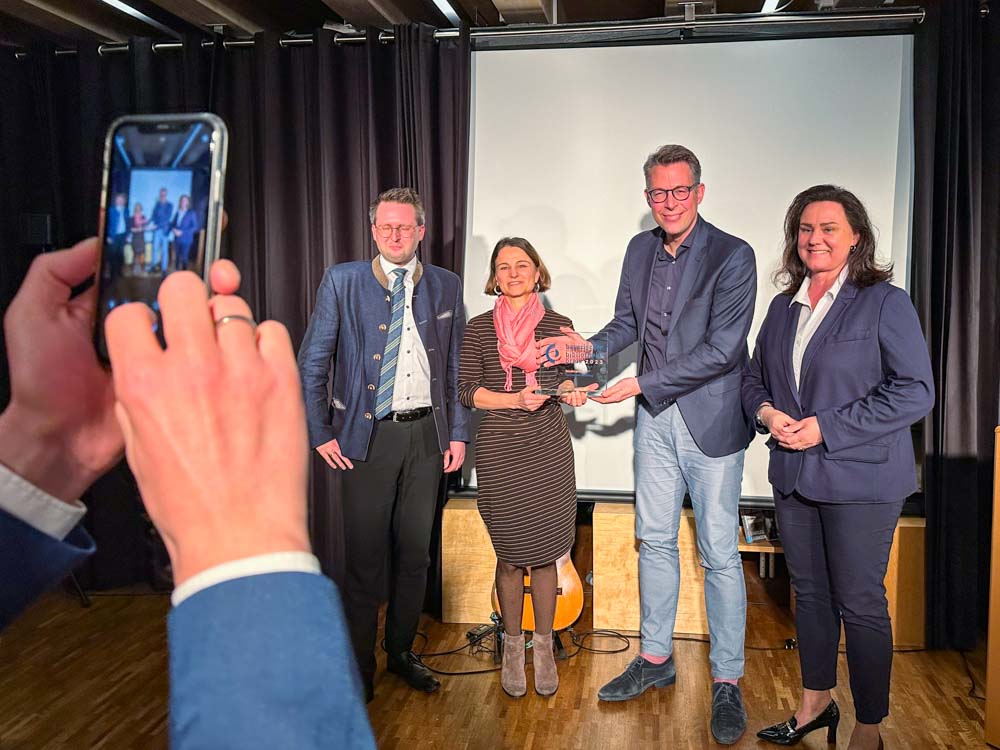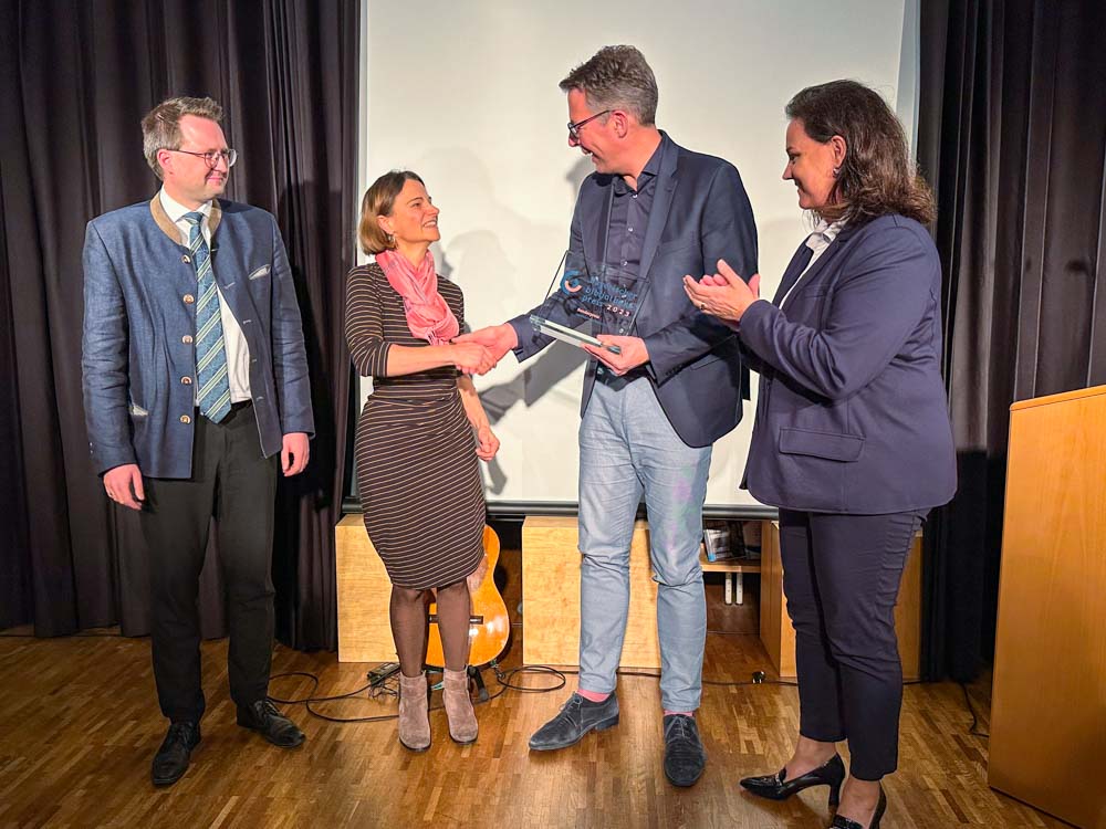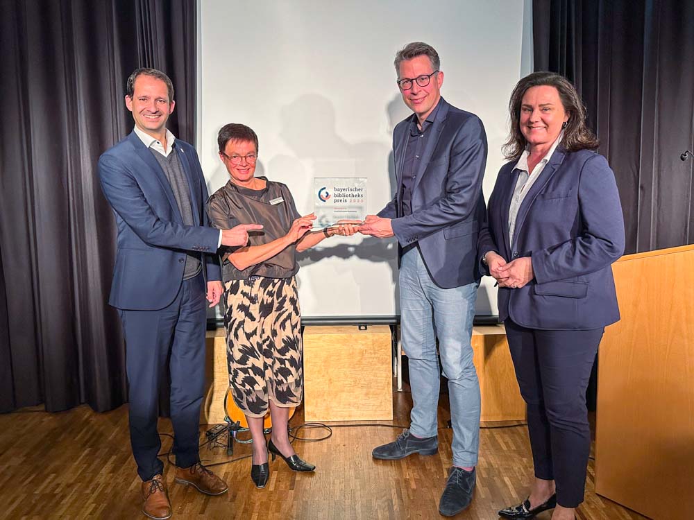 Oberbürgermeister Andreas März (links), Susanne Delp (Stadtbibliothek Rosenheim, zweite von links) mit Markus Blume (Bayerische Staatsminister für Wissenschaft und Kunst MdL) und Dr. Ute Eiling-Hütig (Bayerischer Bibliotheksverband) bei der Preisübergabe
