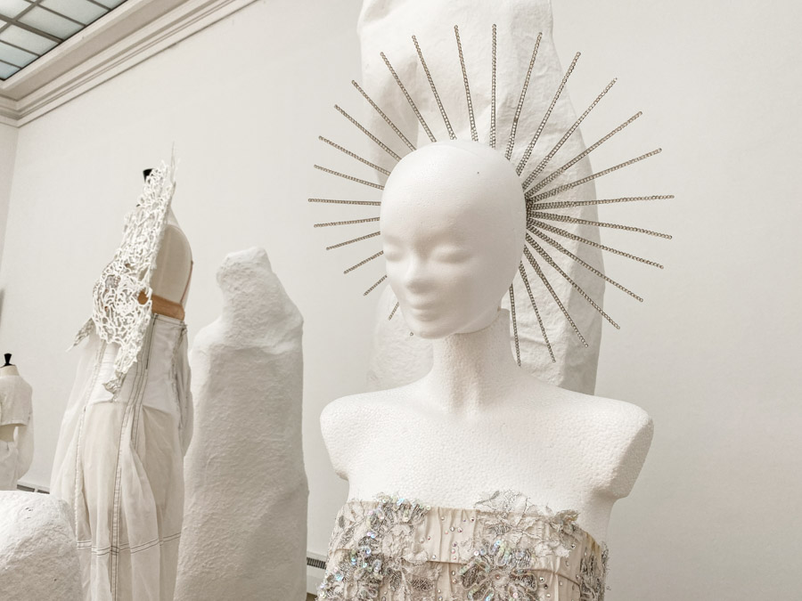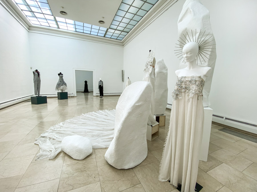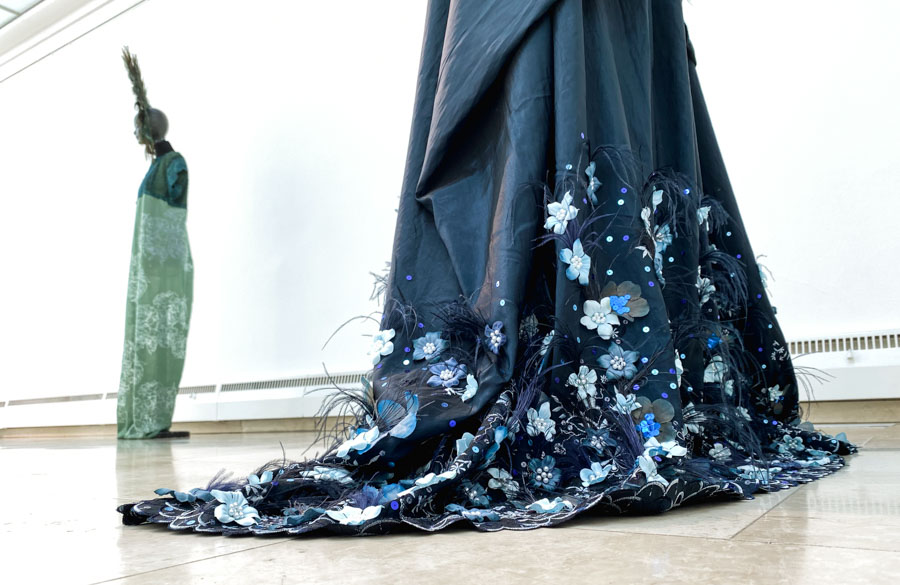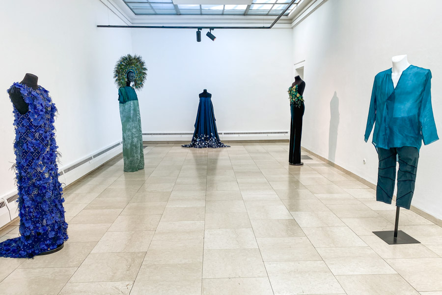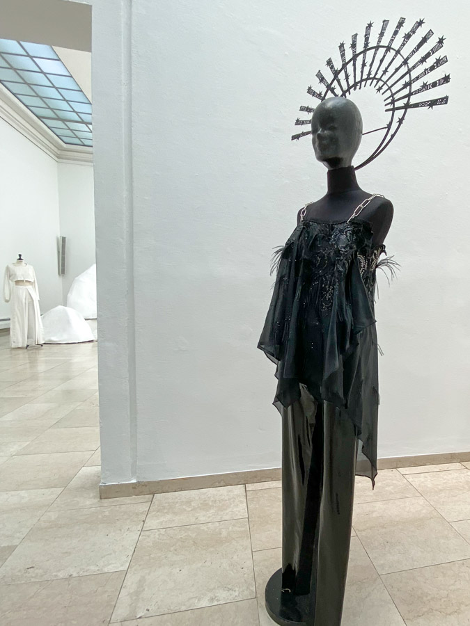 Leider viel zu kurz muss man hier sagen, denn nur zwei Tage kann man die großartigen und aufwendig veredelten Haute Couture Kreationen in den Räumen der Städtischen Galerie bewundern. Die Modelle sind atemberaubend und entführen in die Welten der sphärischen Schönheit und in die Erzählungen der Märchen.