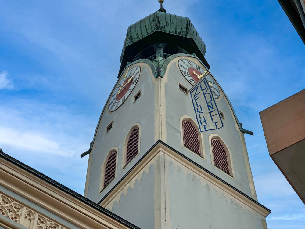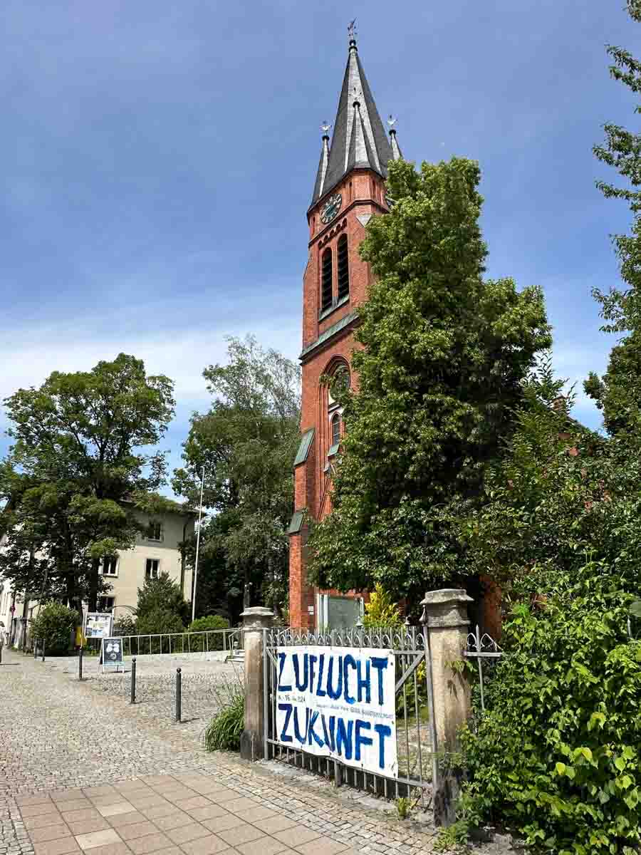 Zuflucht Zukunft Fahne aus dem St. Nikolaus Kirchenfenster