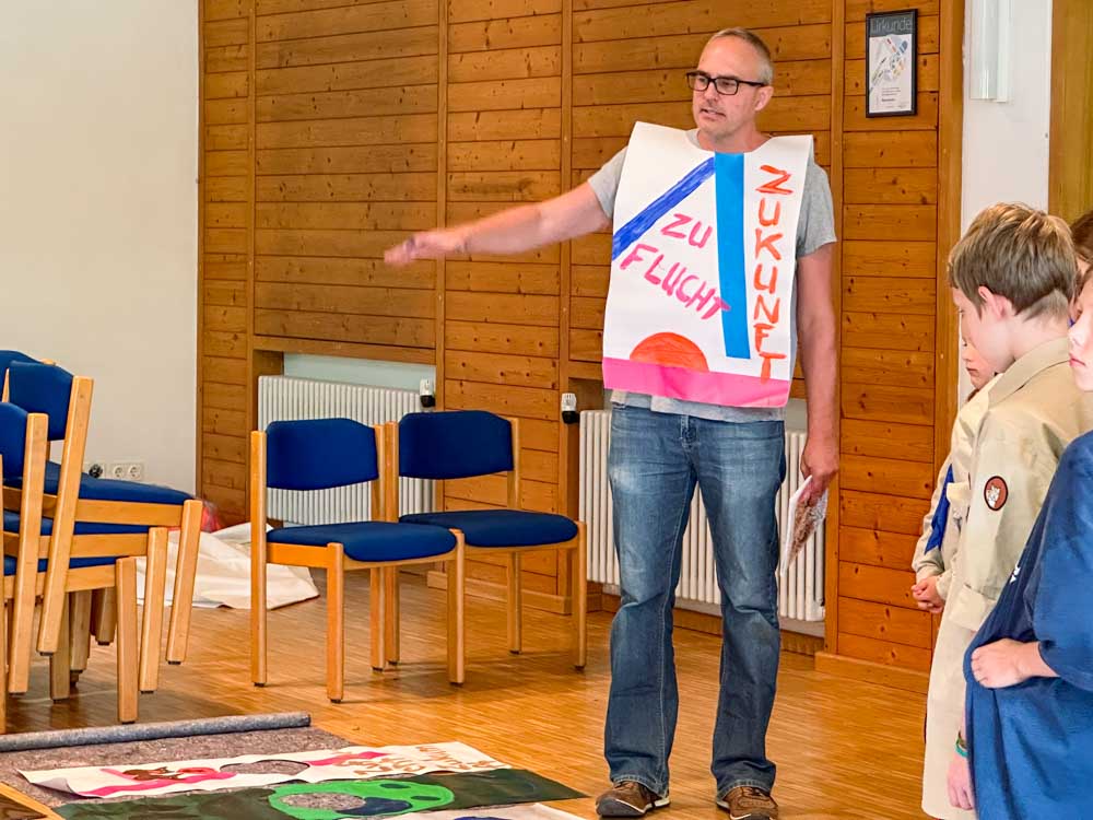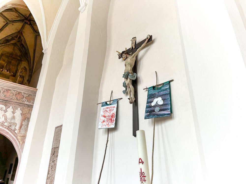 In der Heilig-Geist-Kirche sind die Miniatur eines Pfadfinderzeltes im Tabernakel, zwei Klimaschutzwesten auf Stangen sowie ein Gemälde im Außenfenster zu sehen.