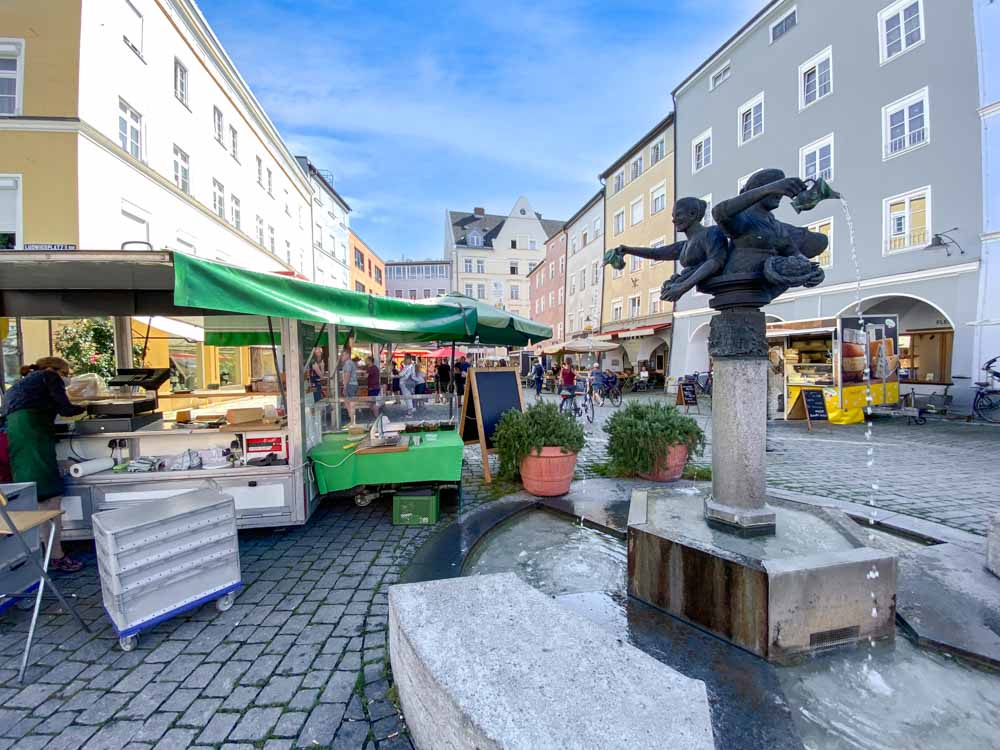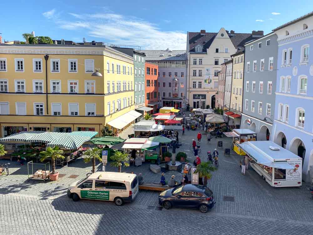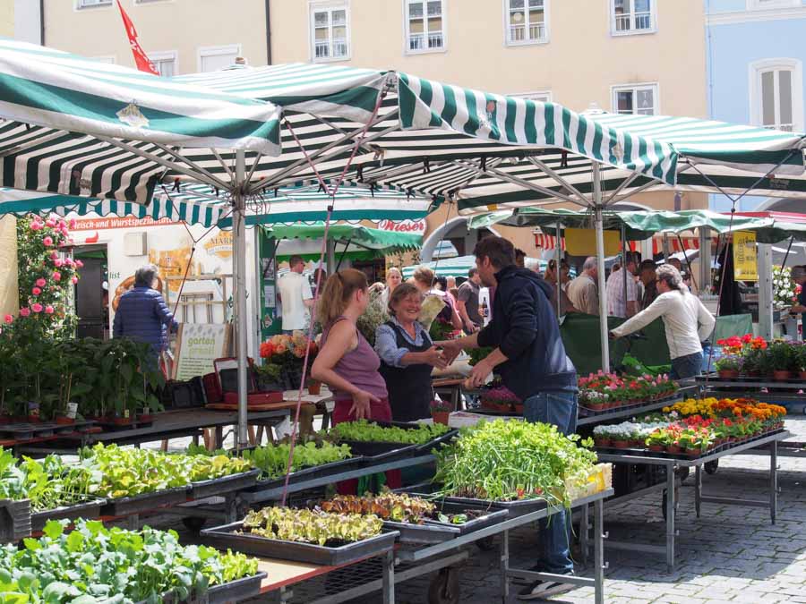 Der Grüne Markt am Ludwigsplatz ist zentral im Herzen Rosenheims gelegen und lädt zum Einkaufen und Verweilen ein. Ein Marktbesuch lässt sich übrigens wunderbar mit einem Einkaufsbummel durch die angrenzenden Läden verbinden.