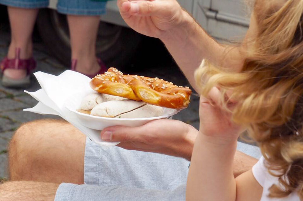 Redet man in Rosenheim von Weißwurstfrühstück, denkt man an Alex (rechts im Bild) und den Lohberger-Stand am Grünen Markt. Er weiß immer (selbst nach Jahren noch) was seine Gäste am liebsten auf dem Würstlteller haben möchten.