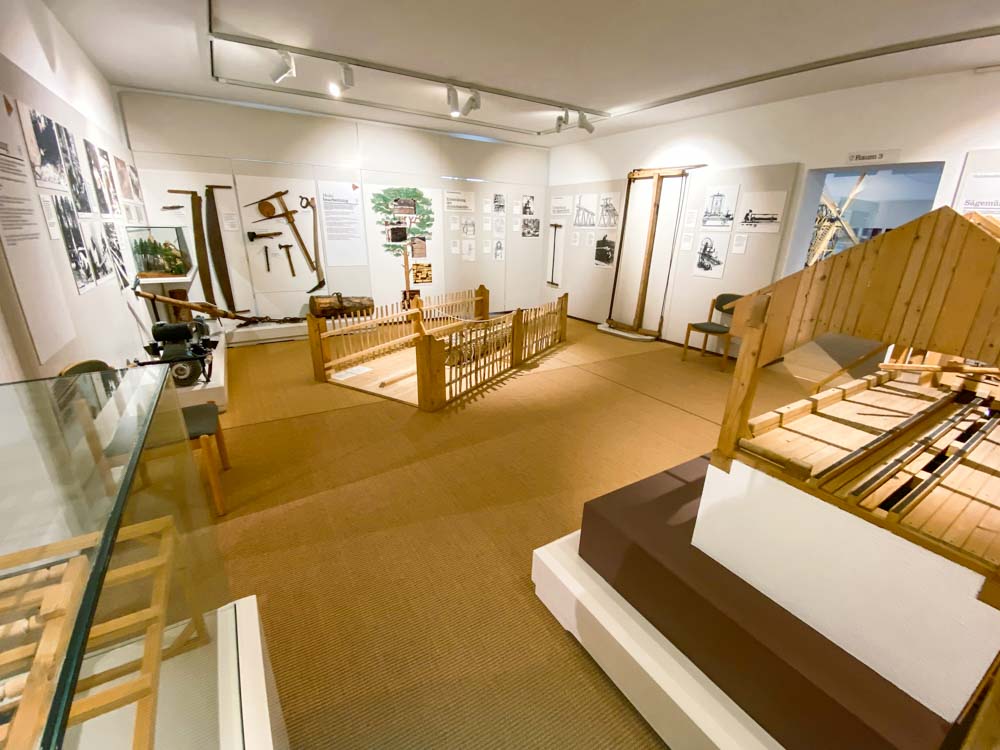 In den geschichtsträchtigen Räumen sind Originalstücke, Anschauungs- und Funktionsmodelle zum Ausprobieren, maßstabsgerechte Maschinen, Holzprodukte sowie Geräte und eine umfangreiche Werkzeugsammlungen ausgestellt.