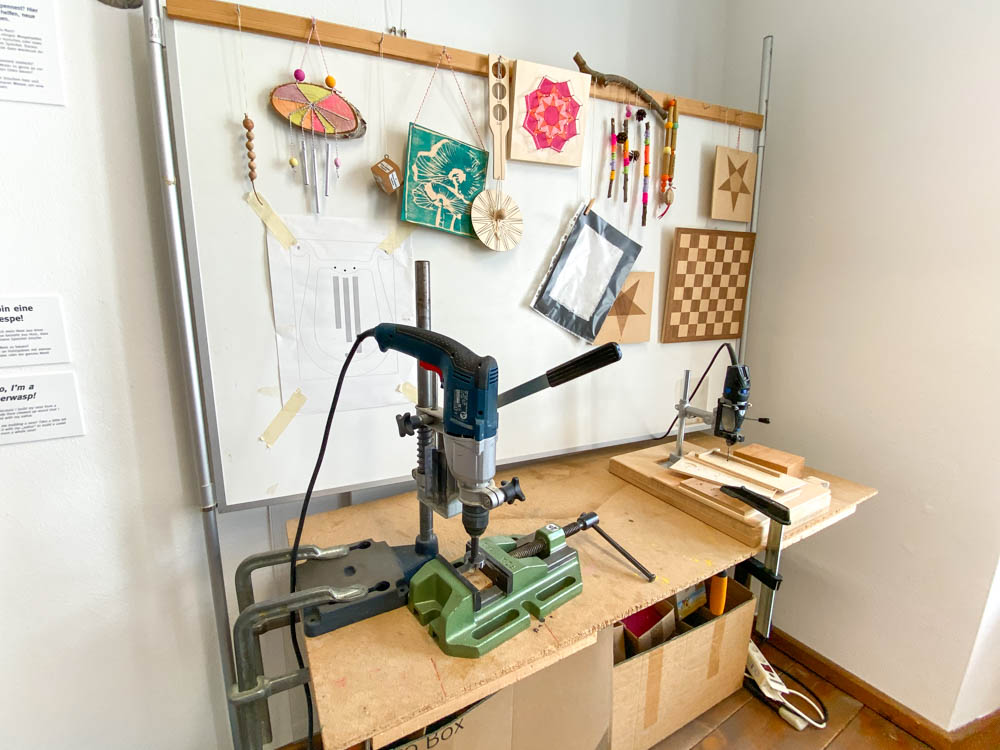Im Holztechnischen Museum gibt es einen eigenen Workshop-Raum mit Arbeitstischen, Stühlen, Basteltisch und Werkzeugen.