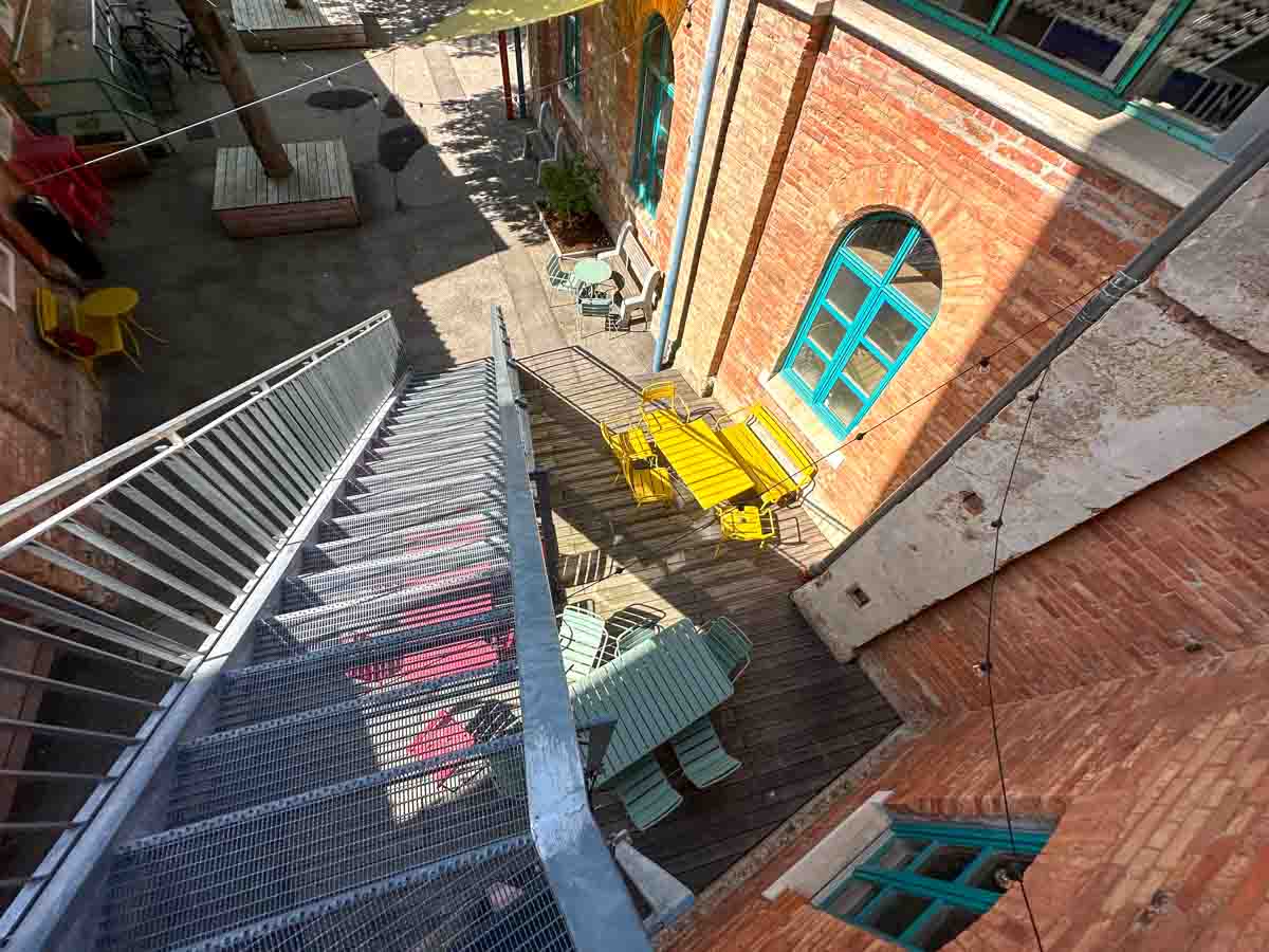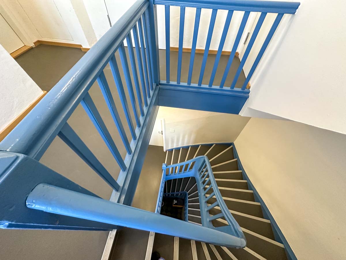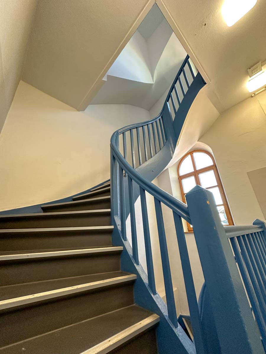 In der Sommerzeit und bei schönem Wetter kommt man von der Bar des Turmcafe in den Turmgarten, sonst geht der Weg nach oben durch das schöne Treppenhaus.