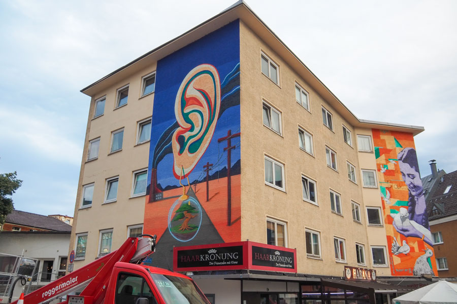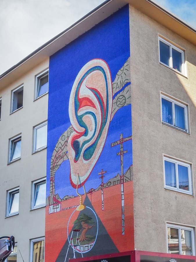 Auf diesem Mural steht das Ohr als Symbol für das Hinhören. Die Welt soll hinhören, denn wenn es so weiter geht wird alles zerstört - außer der Baum, weil dieser in einer geschützten Glaskugel ist.