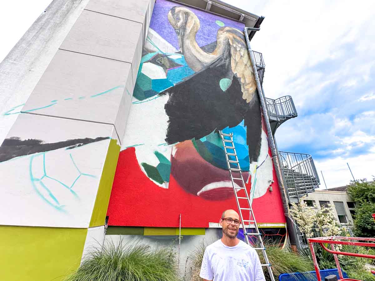 Der Stuttgarter Christoph Jeroo Ganter ist seit 1993 in der Street Art und Graffiti-Szene aktiv. Sein Stil ist harmonisch und dennoch dynamisch, immer auf der Suche nach der perfekten Verbindung zwischen Graffitikunst und der klassischen Ästhetik des Jugendstils. Neben seinen Werken im öffentlichen Raum widmet sich Ganter seit vielen Jahren auch der Malerei auf Leinwänden. 2013 verfasste er das erste umfassende Graffiti-Lehrbuch „Graffiti School“, das sich zu einem Standardwerk dieses Genres entwickelt hat. 2024 schuf Jeroo mit einem überdimensionalen Pfau ein im wahrsten Sinne des Wortes „fabelhaftes“ Mural im Innenhof des Städtischen Museums.