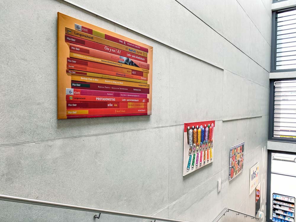 Neben Ausstellungen gestaltet die Fotogruppe der VHS nach wechselnden Themen das lichtdurchflutete Treppenhaus, z.B. Thema Blau.